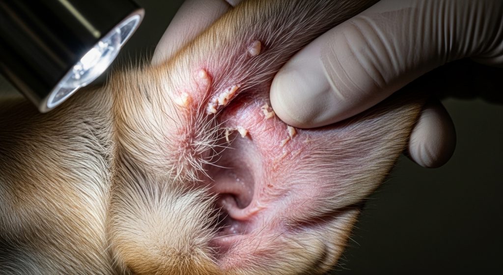 • Crusty, thickened skin, especially on ear edges, elbows, and belly