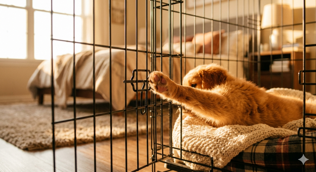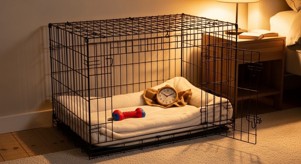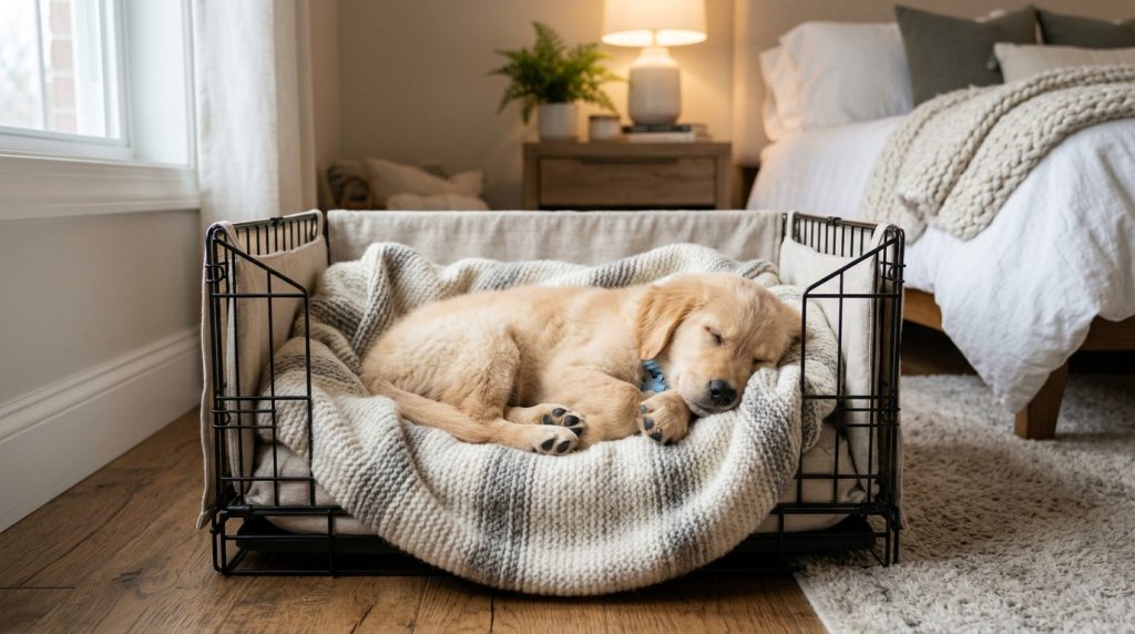 For the first few weeks, keep the crate in your bedroom — close to your bed if possible. Puppies feel safer when they can hear and smell you. Once they’re comfortable, you can slowly move the crate to another room.